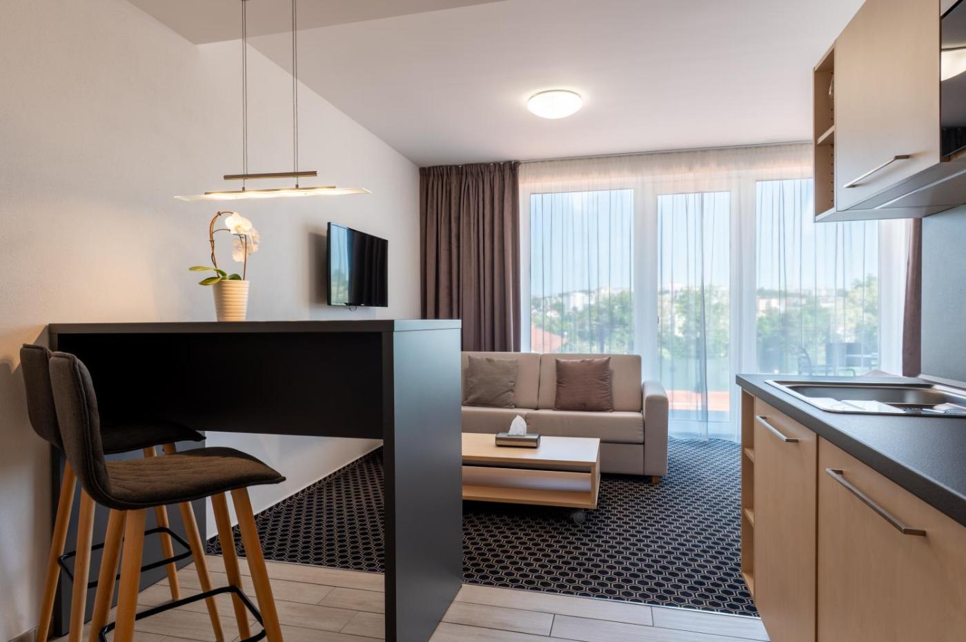 Suite. The air-conditioned suite has 1 bedroom and 1 bathroom with a shower and a hairdryer. Guests can make meals in the kitchenette that features a stovetop, a refrigerator, kitchenware and a microwave. Boasting a terrace, this suite also features soundproof walls, a tea and coffee maker and a flat-screen TV with satellite channels. The unit has 4 beds. ;